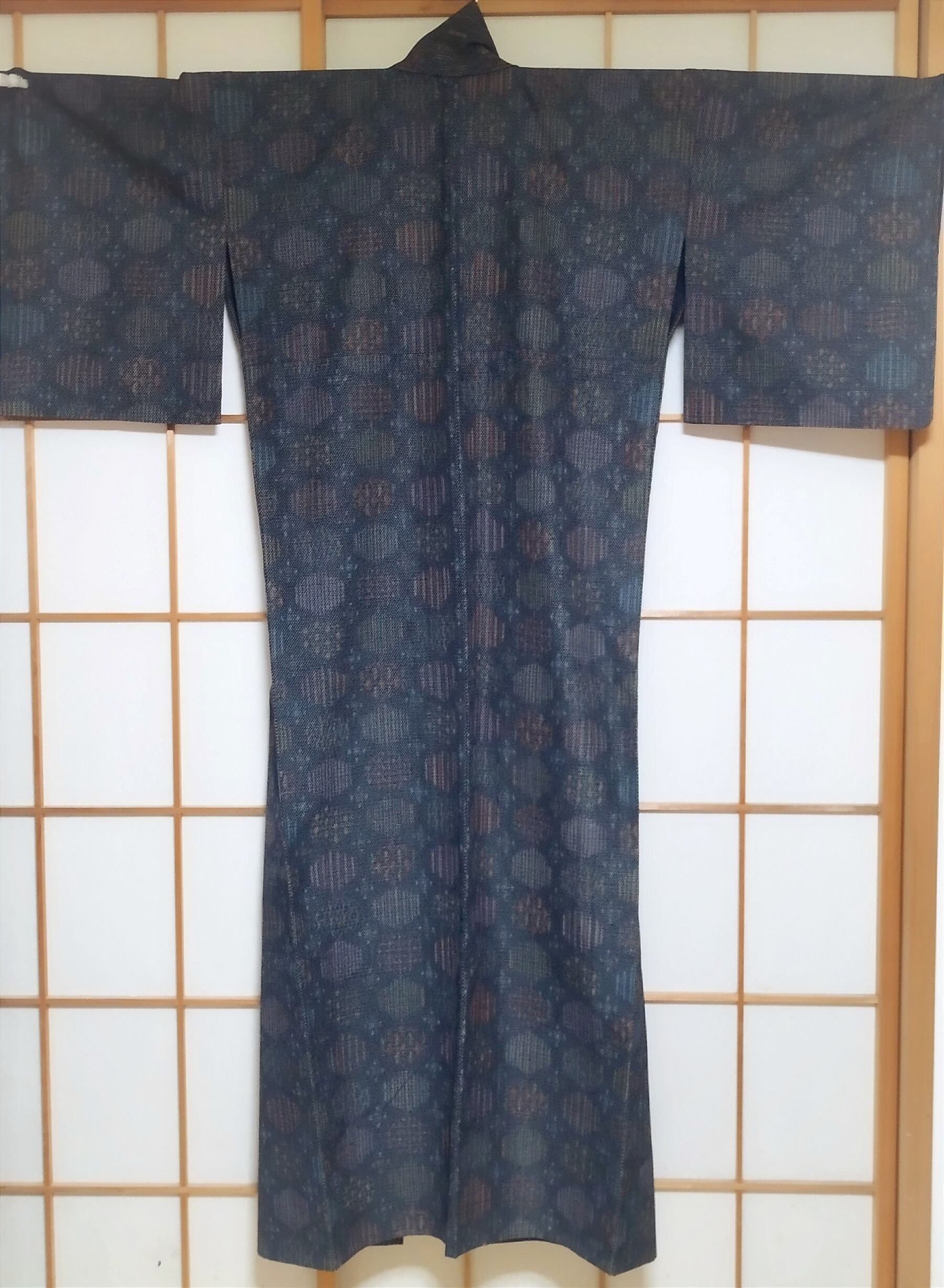 ポップなラウンド柄の紬(つむぎ)のきものです。