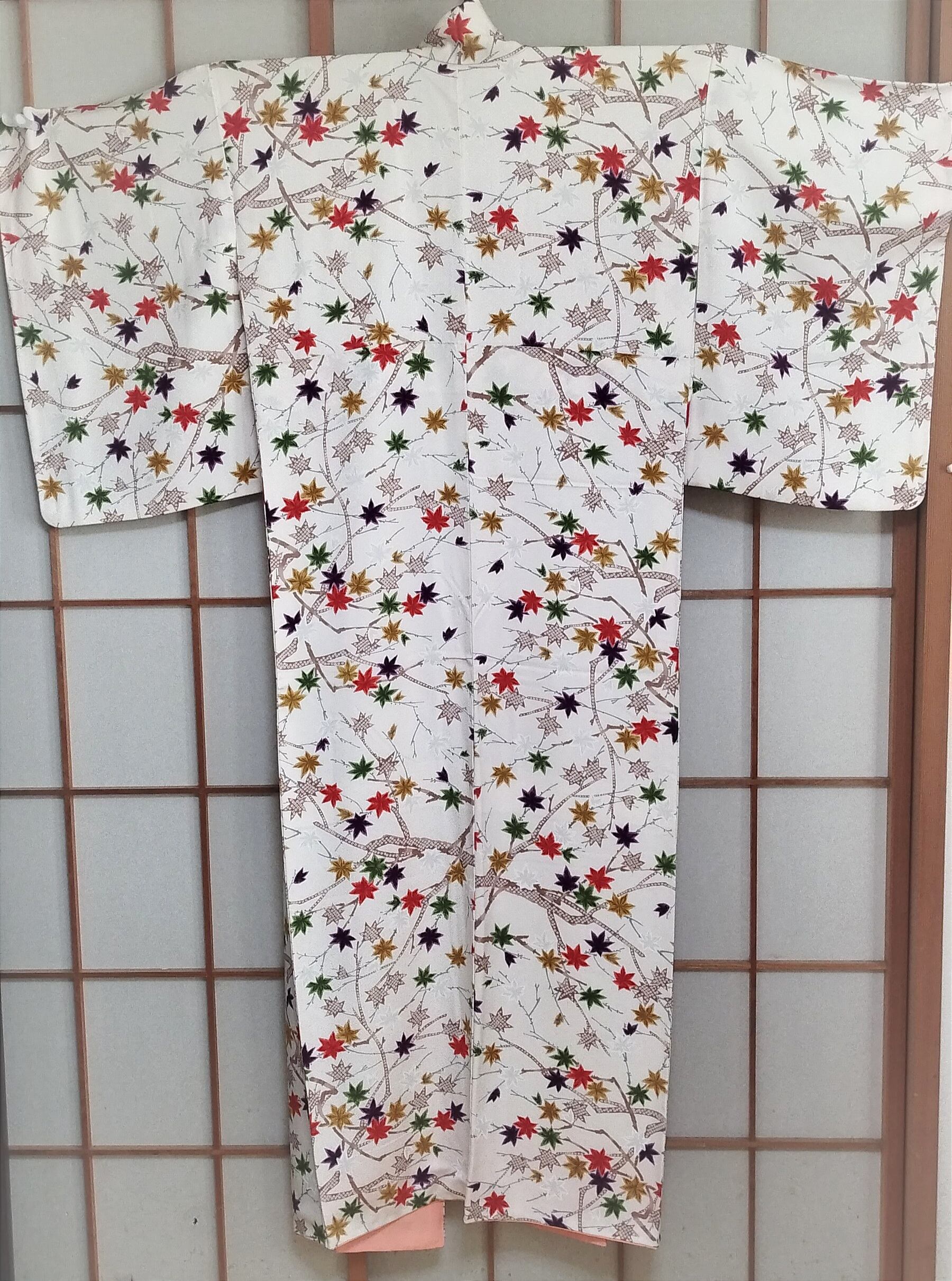 春の青から秋の赤、地模様に雪の白と季節折々の紅葉が楽しめるこちらの着物は、